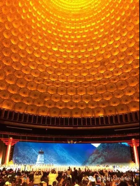 開幕式現(xiàn)場(chǎng)進(jìn)行佛教相關(guān)歌舞表演,背景屏幕不時(shí)顯現(xiàn)彩色蓮花,穹頂伴隨梵音呈現(xiàn)七彩變化,場(chǎng)面壯觀。