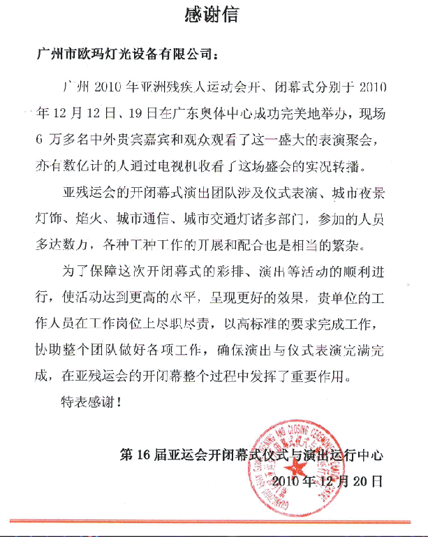 第16屆廣州亞運(yùn)動(dòng)會(huì)感謝信