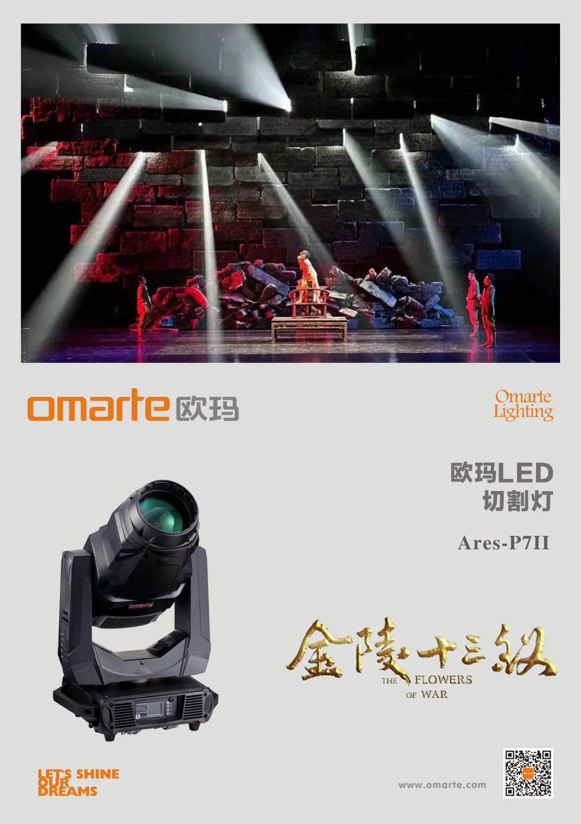 舞劇《金陵十三釵》燈光總設(shè)計(jì)楊浩,設(shè)計(jì)靈感來源國(guó)學(xué)經(jīng)典《毛詩序》名句“情動(dòng)于中而形于言,言之不足,故嗟嘆之,嗟嘆之不足,故詠歌之,詠歌之不足,不知手之舞之,足之蹈之也”。燈光設(shè)計(jì)通過獨(dú)特的光影語匯來粘合表演和舞臺(tái),畫光為手,畫光為舞。光之舞之,光之蹈之,用光影把舞劇《金陵十三釵》的敘事性、抒情性、表現(xiàn)性統(tǒng)一起來。