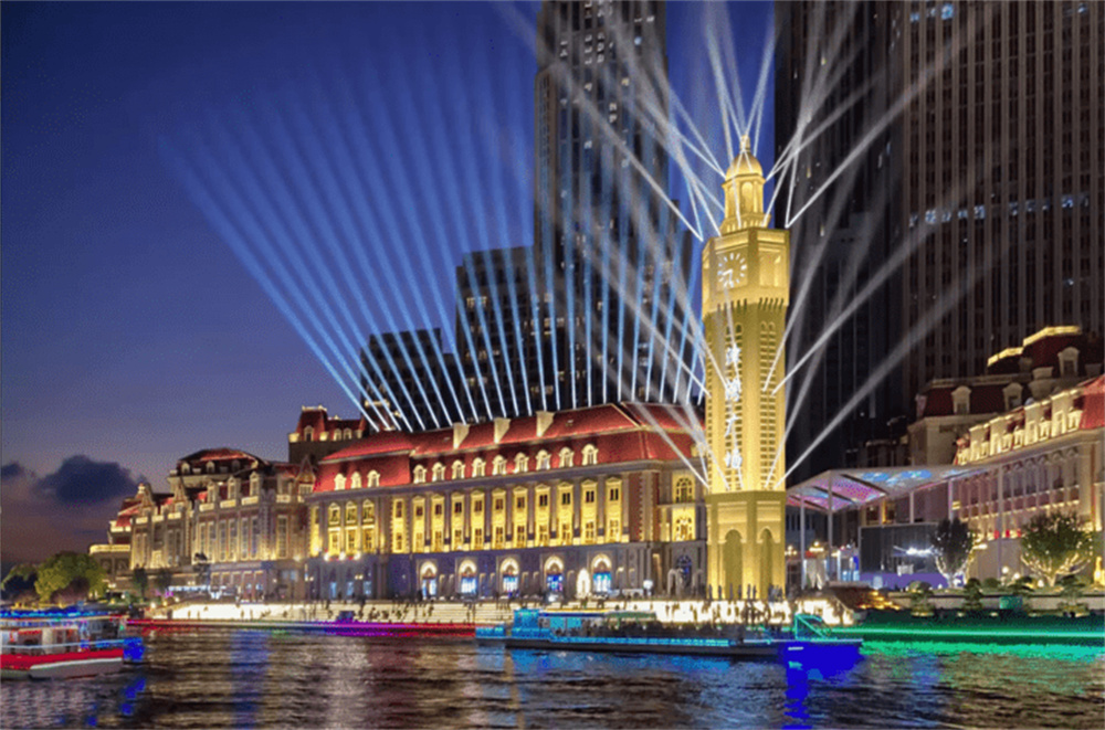 伴隨著悠揚的音樂、璀璨的燈光,現(xiàn)場400臺激光燈和光束燈,形成4000平米的燈光畫面,展現(xiàn)天津歷史風貌、非遺文化等內(nèi)容。