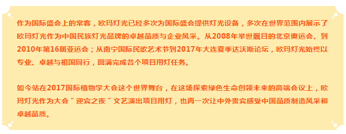 歐瑪燈光璀璨綻放第十九屆國(guó)際植物學(xué)大會(huì)"迎賓之夜"文藝演出,與2500位來(lái)自世界各地的植物業(yè)界權(quán)威專家、科學(xué)使者,一起感受東道主的熱情以及濃郁的中國(guó)元素。