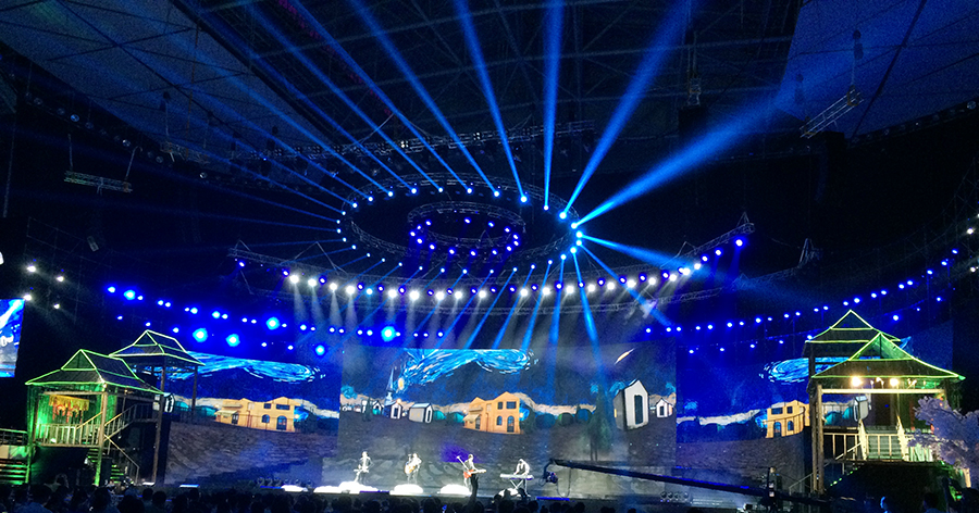 Ou Ma lights 1500W large beam OA3500BEAM, 1500W shake head pattern light OA3500SPOT, LED shake head light (LED904) to help the annual folk song arts festival party, with sparkling stars to write "Silk Road landscape, painting folk songs" beautiful picture scroll.