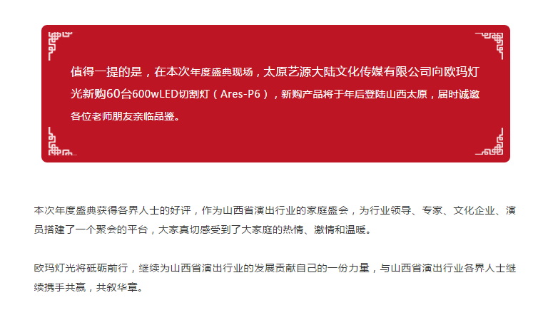 作為本次2017山西省演出行業(yè)協(xié)會(huì)年度盛典現(xiàn)場(chǎng)官方指定用燈,歐瑪燈光600wLED切割燈(Ares-P6)、7顆60wLED電腦搖頭燈(Ares-B7)、LED光束燈(Ares-B5)、LED染色燈(LED-300)、1500W大追光燈(GatLing 1500),為年度盛典的順利進(jìn)行保駕護(hù)航!