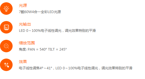 類(lèi)型: 7顆60W,歐司朗四合一LED光源。 · 平均壽命: 大于20000 小時(shí)。 色彩系統(tǒng) · RGBW四合一 效果 · 電子線性調(diào)焦4o~41° · LED 0~100%電子線性調(diào)光,調(diào)光效果特別的平滑
