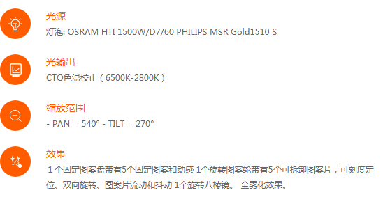 ? ? ? ?最新的OSRAM 1500w氣泡燈,顯色指數(shù)Ra>85。4片全切試切割系統(tǒng),每一片都能完全切入,切割片的切入深度和角度都可以單獨(dú)調(diào)整。專(zhuān)利設(shè)計(jì)的全線性調(diào)光系統(tǒng)。4個(gè)切割片可以切出矩形、三角形、梯形,以及其他圖形。帶有5種可拆卸圖案片的旋轉(zhuǎn)圖案盤(pán),5個(gè)固定圖案的固定圖案盤(pán),6種顏色片的顏色盤(pán)。圖案加上顏色,再配合動(dòng)感效果,可以創(chuàng)造出數(shù)種動(dòng)態(tài)的投影效果。比如波光粼粼的水面,熊熊竄動(dòng)的火焰等。