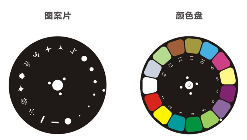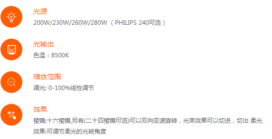 燈泡: 200W/230W/260W/280W (PHILIPS 240可選) 色溫:8500K 平均壽命:2000H 顏色: 14種顏色+空白 圖案: 17個(gè)固定圖案片+空白