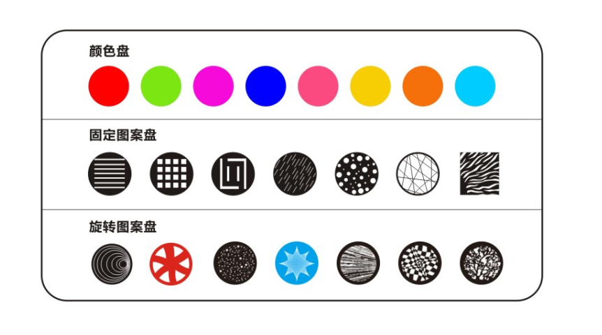 · 1個旋轉(zhuǎn)圖案盤: 7個插拔式的旋轉(zhuǎn)圖案片+空白;帶圖案抖動和任意定位功能