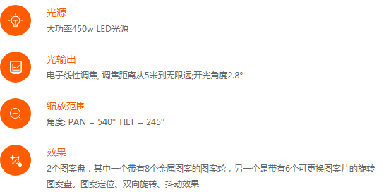 Ares-B5,采用450wLED光源,配合定制的光學(xué),能產(chǎn)生超強(qiáng)沖擊力的光束。驚人的20000小時(shí)壽命,燈的整個(gè)生命周期里,都不用再為更換燈泡而煩惱。外置系統(tǒng)快速升級接口,可以一次性批量升級燈具系統(tǒng)。自帶獨(dú)有的隱藏式折疊燈鉤專利集成系統(tǒng)。具有2個(gè)圖案盤,其中一個(gè)帶有8個(gè)金屬圖案的圖案輪,另一個(gè)是帶有6個(gè)可更換圖案片的旋轉(zhuǎn)圖案盤。標(biāo)配五棱鏡(可定制八/十六棱鏡)、1個(gè)霧化片。電子線性調(diào)焦