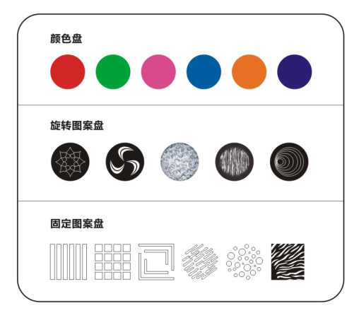 ·?1個(gè)旋轉(zhuǎn)圖案盤:?5個(gè)插拔式的旋轉(zhuǎn)圖案片+空白;帶圖案抖動(dòng)和任意定位功能